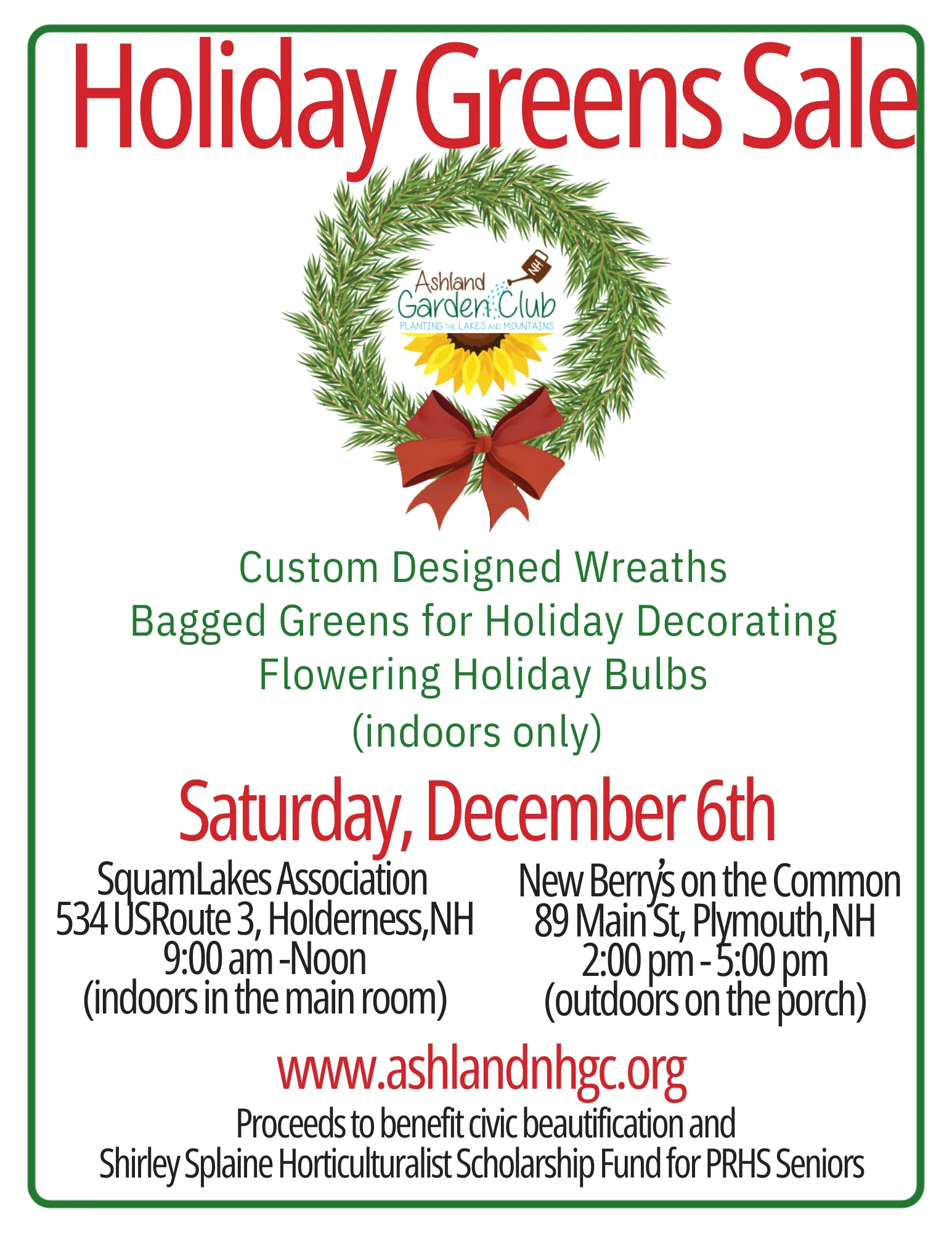 The Ashland Garden Club is hosting a Holiday Greens Sale at the Squam Lakes Association Great Room from 9am - 12pm.